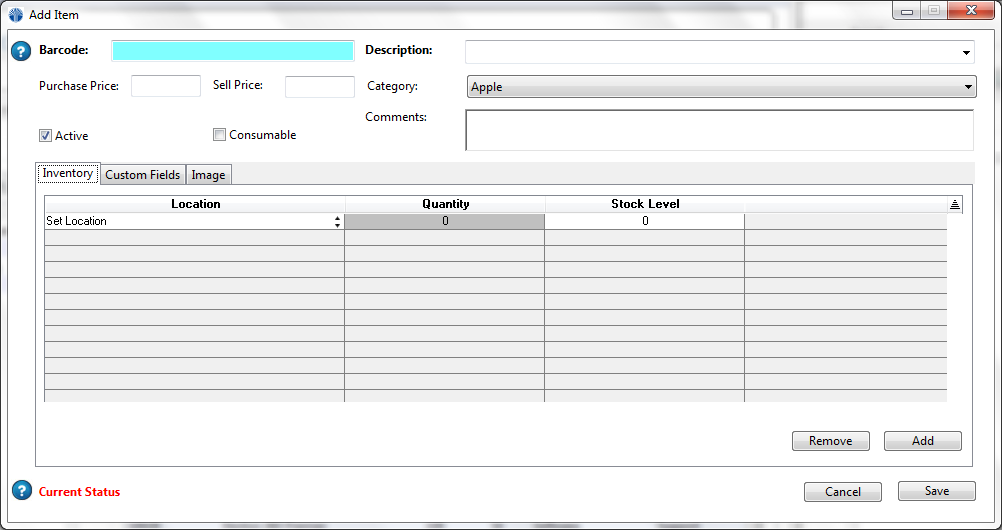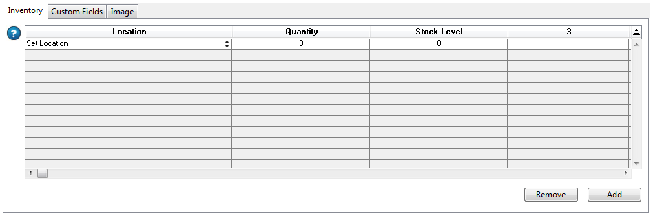 The Inventory Tab at the bottom of the screen is used to add the initial location(s) and quantity(s) of this stock item. Select a location from the "Set Location" pull down menu. Then set the initial quantity and stock level(optional) by clicking in the cell. Set as many locations and quantities as you wish. To remove an inventory entry, just highlight the entry and click ‘Remove’. Click ‘Add’ if you wish to create a new inventory entry