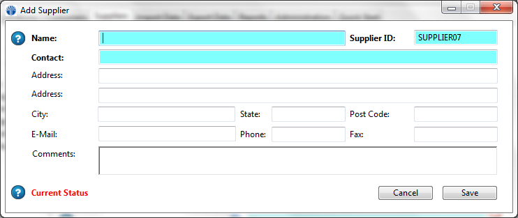 - Supplier ID: This is the Supplier Barcode and it must be unique. This is a mandatory field. A Supplier Barcode will be suggested to you. The Supplier ID can be typed or barcode scanned in.