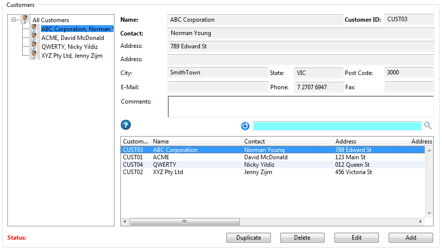 The Customers screen is used to manage all of your Customer information. All of the Customers are presented in the list box at the bottom of the screen. To view Customer information click the Customer in the list box and all of the information will be listed in the text boxes at the top of the screen.