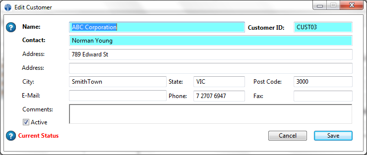 Edit the Customer Details. The Customer ID, Name and Contact are mandatory fields and can not be left blank. The Customer ID cannot be changed to a value that already exists. If the Active checkbox is unchecked then the Customer will not appear in other screens and Reports. When all changes have been made click Save (or Cancel to discard the edits).