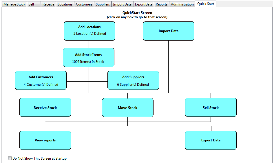 - When the My Inventory software is first opened you will be guided to the Quick Start Screen. Simply click on any box to go to that area.