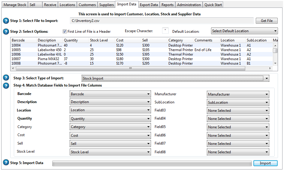 The Import Data Screen is a simple way to import information into the "My Inventory" software database. You can import data using a text file (in csv format). The easiest way to create a csv import file is to enter your data into Microsoft Excel and then to use Save As to convert it into a csv format.
