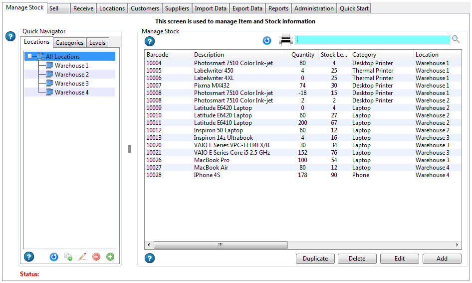 The main screen of the My Inventory software is the Manage Stock screen. This screen provides a single view of your entire inventory. It provides the ability to add, edit, delete, move and search your inventory.
