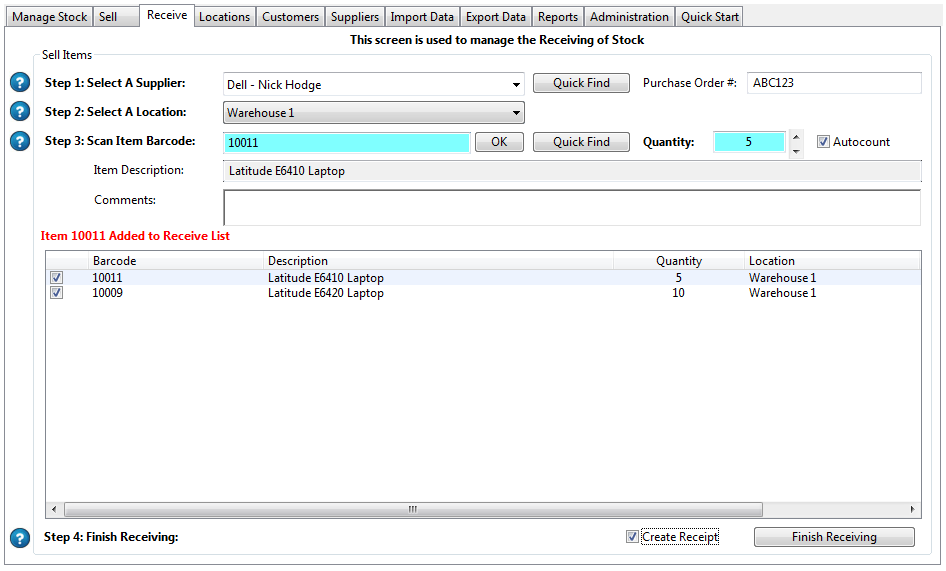 The Receive Screen is where you enter all of the information about the items you receive from your Suppliers: