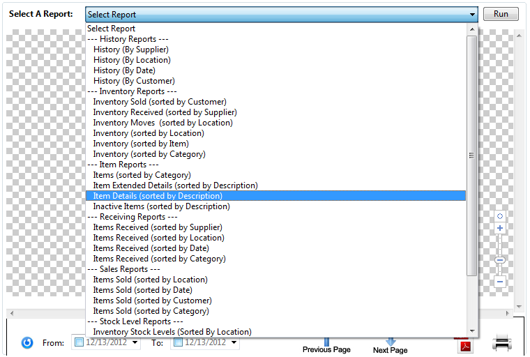 The Reports Screen is used to generate a set of preset reports. Simply select the report you wish to generate from the “Select a Report” pull down menu and then click the “Run” button.