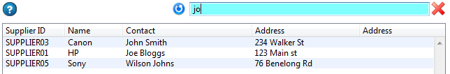 The Search for Supplier function allows you to search across all of the Suppliers. Just type the data into the box and hit the Enter key. The results will be displayed in the Supplier list box. When you are finished with the search, click the red arrow on the right of the search box to clear the results and display the full Supplier listing.