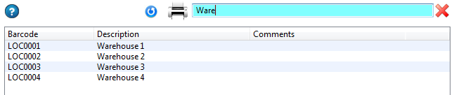 The Search for Location function allows you to search across all of the Locations. Just type the data into the box and hit the Enter key. The results will be displayed in the Location list box. When you are finished with the search, click the red arrow on the right of the search box to clear the results and display the full Location listing.