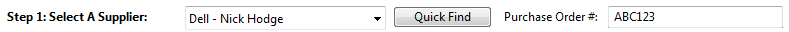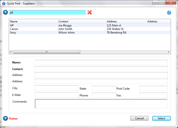 - Click the Quick Find button. A form will appear which will provide a quick search capability to find the Supplier. As you type characters into the search box the Suppliers that match will appear in the list box. To get back to all Suppliers, click the red X next to the search box or simply clear all characters from the search box. Double click the Suppliers or click select to choose a Supplier.