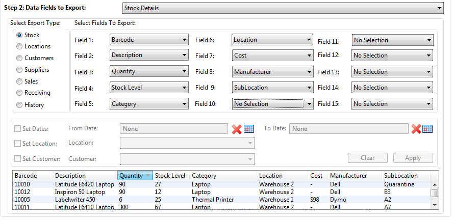 Depending on the type of export you have selected certain fields will become available at the bottom of step two to help you narrow down the data you want (e.g. select “Location”, “Customer”, “Supplier” or a date range).